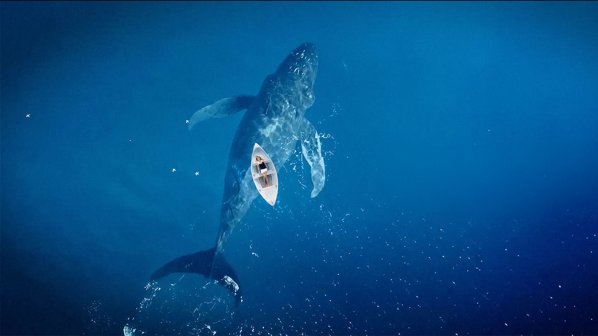 Grazie all’intelligenza artificiale, reale e fantasia si fondono, dando vita a un racconto visivo dove tutto diventa possibile — una ragazza naviga in mezzo al mare e scopre, con meraviglia, di trovarsi sospesa sopra una magnifica balena, simbolo del sogno che prende vita davanti ai nostri occhi.