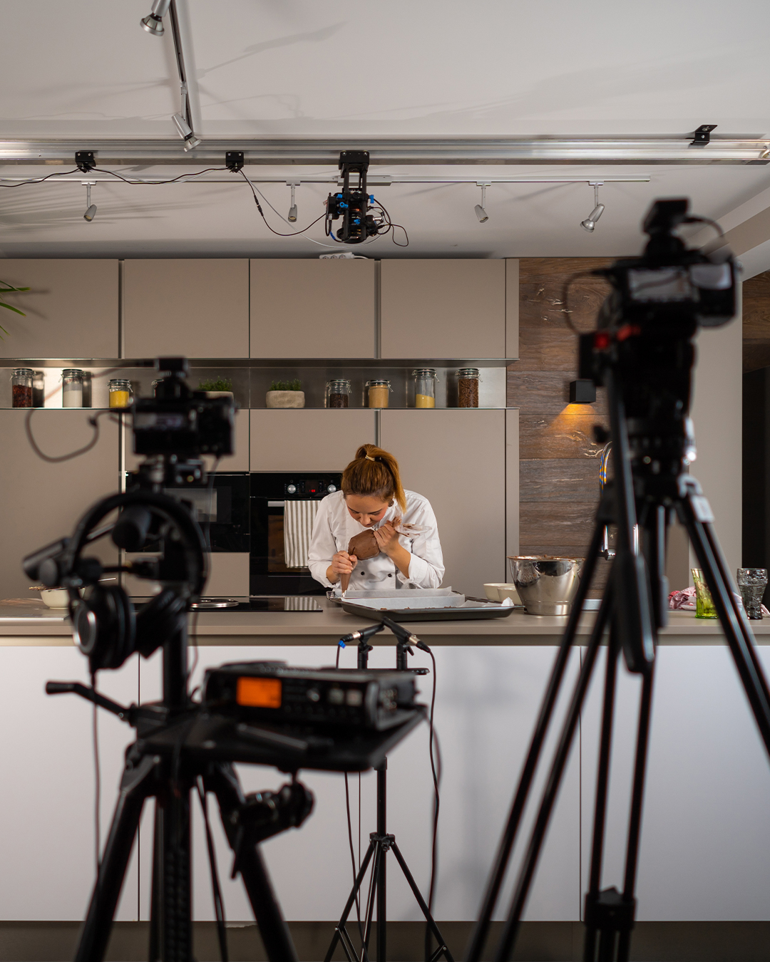 Atmosfera sofisticata: illuminare solo la postazione di lavoro con skypannel led, con un background scuro, creare un’inquadratura stretta sullo chef e sul dettaglio delle mani o sul volto (questo ti permetterà di ottenere un taglio del video per stories e reel). L’illuminazione è circoscritta a un fascio che da importanza all’azione e non al contesto, lo sfondo nero trasmette eleganza grazie ai giochi di ombre e luci.